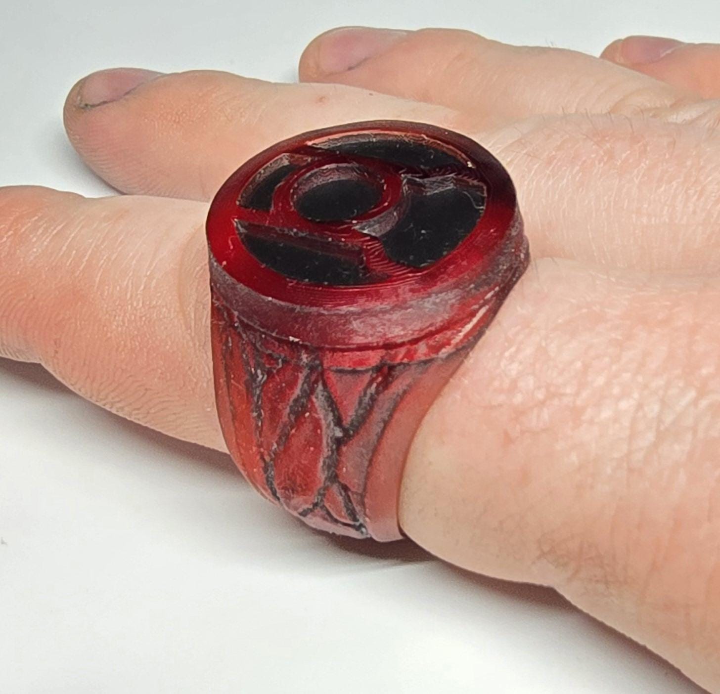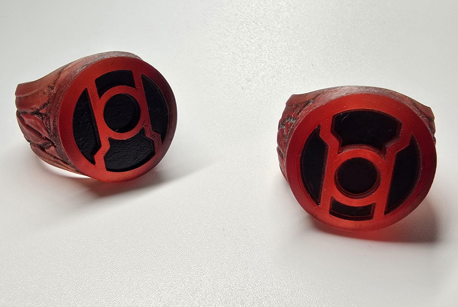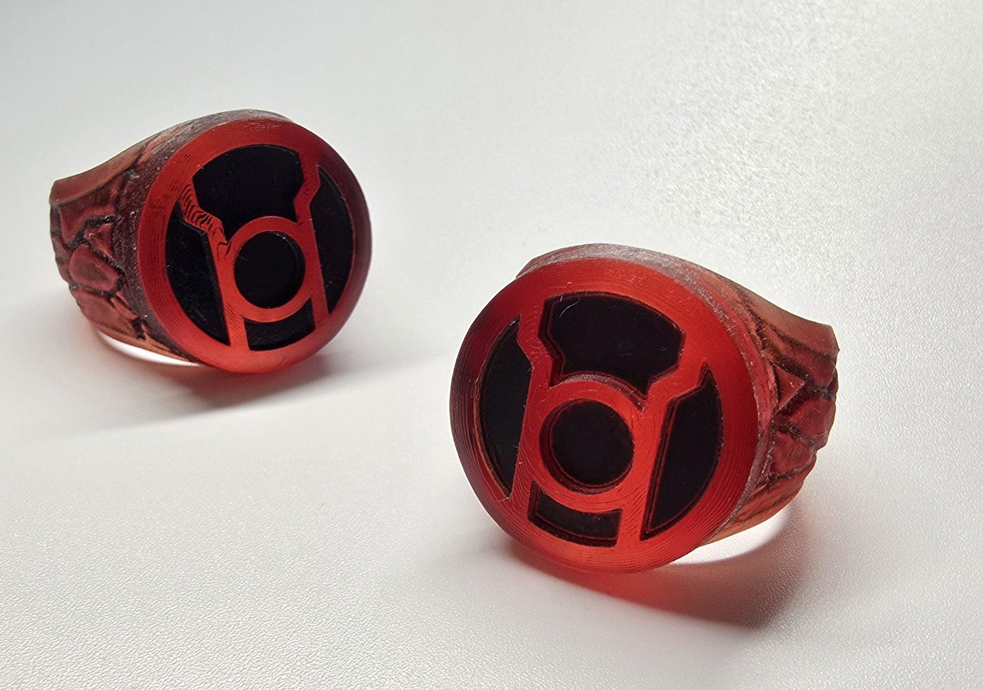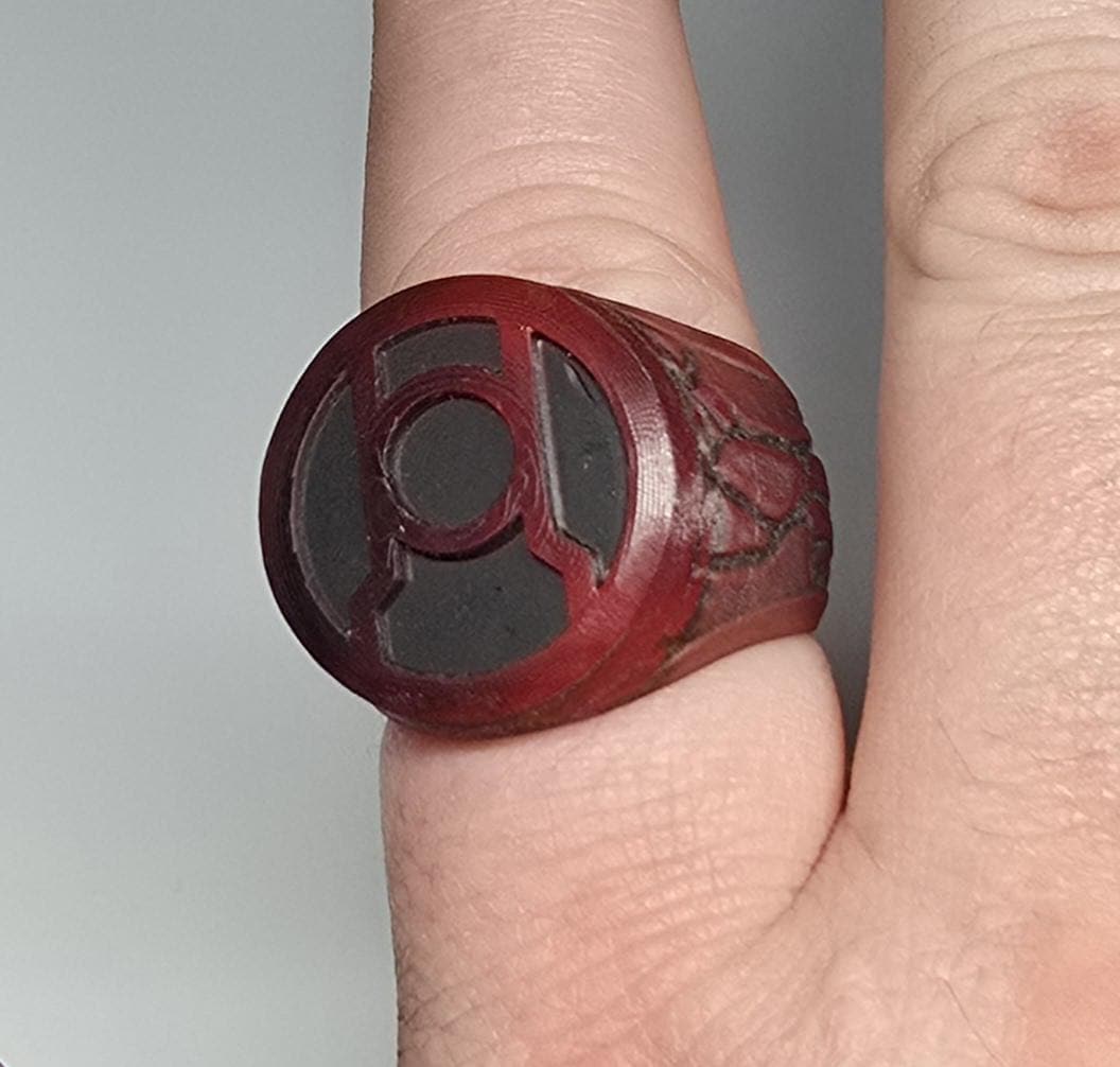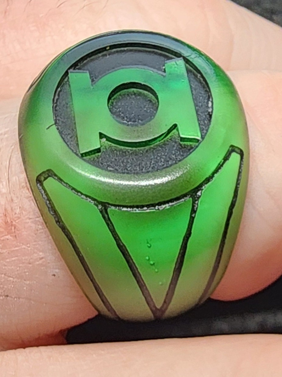 These are custom 3D-printed resin Green Lantern or Red Lantern rings. Each ring is made to order, ensuring a perfect fit for your finger. Please remember to message me your ring size when placing your order to guarantee the right fit. The process involves printing, painting, and sanding, which takes about 3 to 5 days. If everything goes as planned, your ring will be shipped within 5 days of your order. For the best experience, ensure to provide your ring size promptly to avoid any delays. Perfect for fans of the Lantern Corps, these rings are a must-have collectible!
