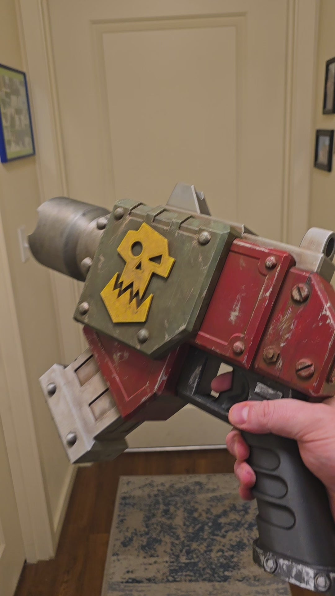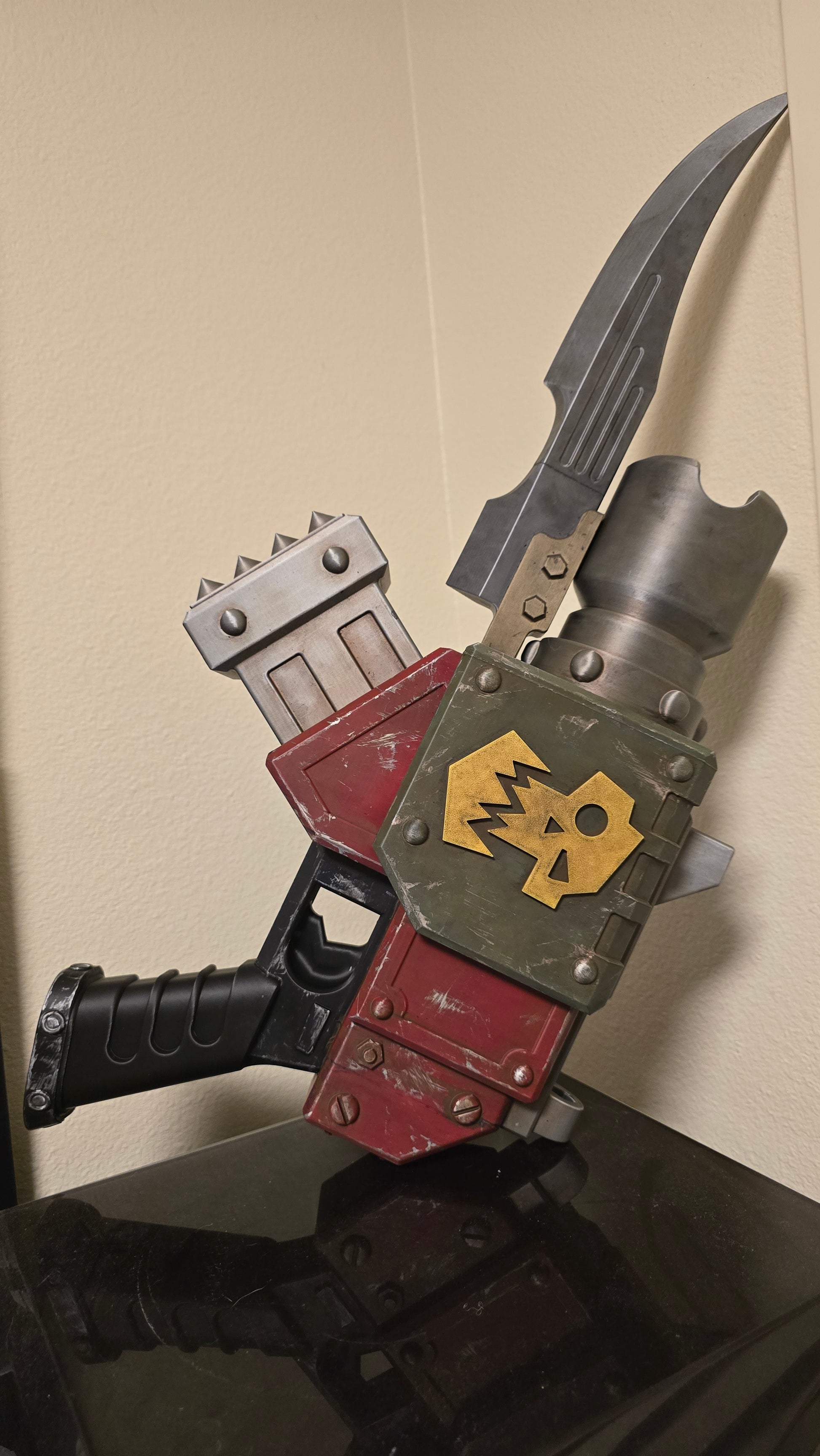 Show off yer inner Ork with this choppy-shooty combo straight from da battlefields of the 41st millennium. Whether yer stompin' into a cosplay event, krumpin' some gitz at a LARP, or just want a brutal-lookin’ slugga for yer shelf, this 3D-printed Ork Blasta is built to impress—an' maybe scare a few humies too.
