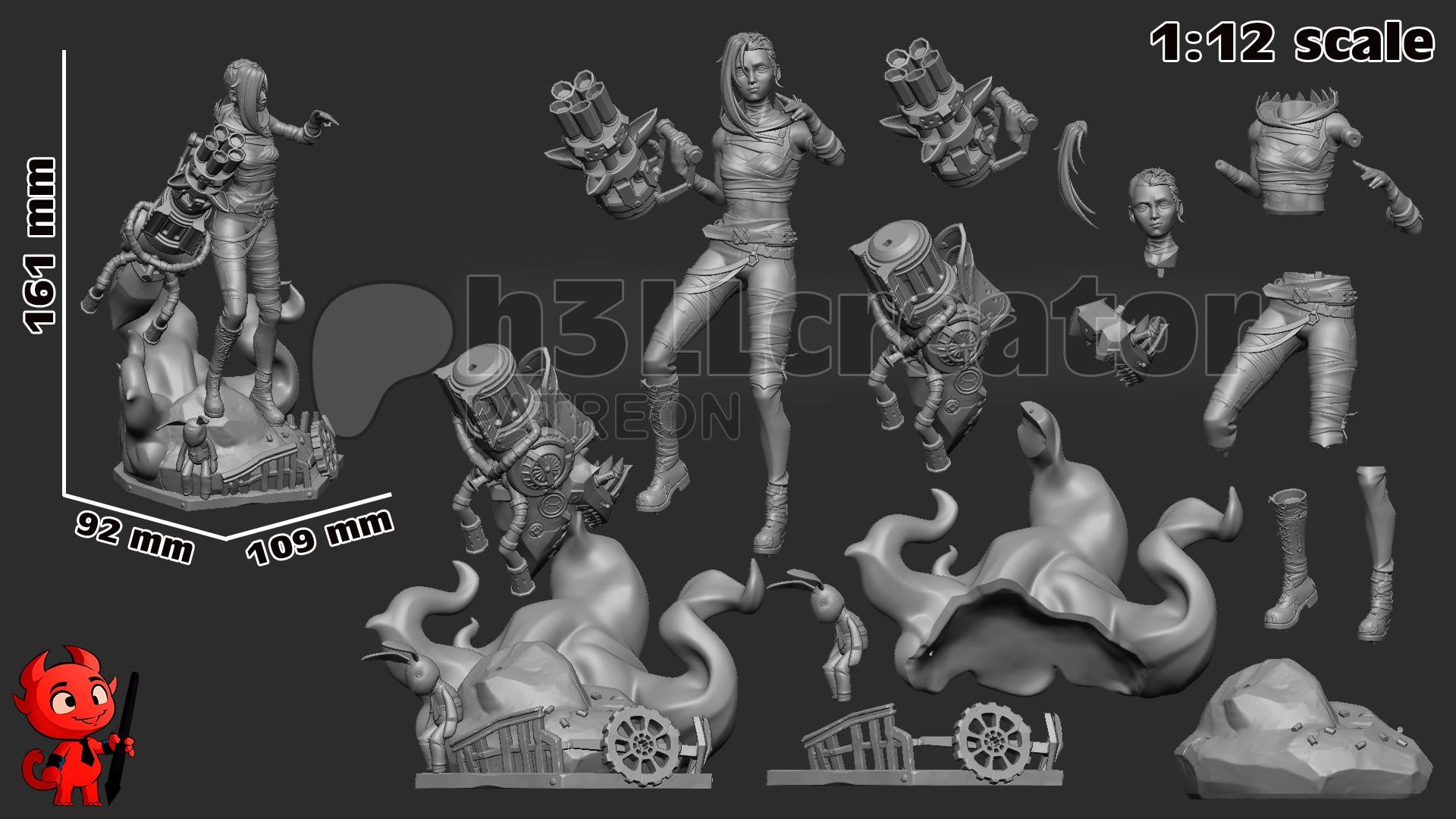 This 1:12 scale resin 3D printed statue of Jinx, inspired by Arcane and League of Legends, captures the chaotic energy and vibrant personality of the iconic character. The model features intricate details, showcasing her wild expression and signature style.